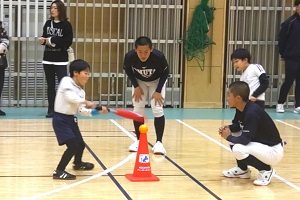 1/24、大牟田高校野球部員のみなさんとの野球体験レクレーション。かっこいいお兄ちゃん達にボール投げやバッティングなどを教えてもらいました。