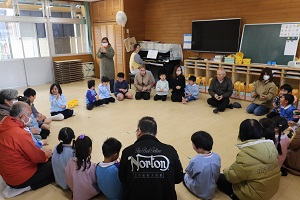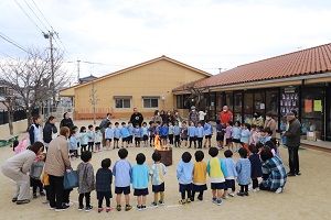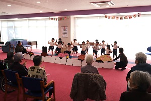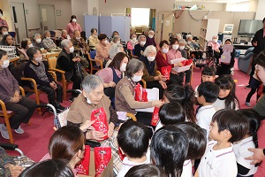 12/23、老人施設『美さと』訪問。年中年長の子ども達が元気いっぱいのお遊戯を披露してくれました。おじいちゃんおばあちゃんからたくさんの拍手を頂きました。