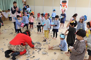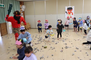 2/3、赤鬼がやってきました。ちょっと怖かったけど、みんなで豆を投げて鬼をやっつけました。