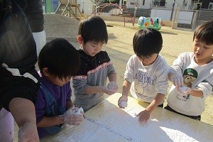 1/14、もちつきをしました。ついて、丸めて、そしてみんなでおいしく食べました。1/15はどんど焼きとお手玉遊び。おじいちゃんおばあちゃんと楽しい一時を過ごしました。