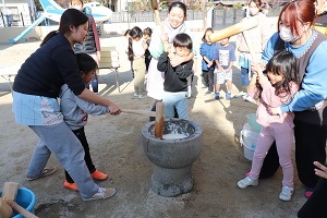 1/14、もちつきをしました。ついて、丸めて、そしてみんなでおいしく食べました。1/15はどんど焼きとお手玉遊び。おじいちゃんおばあちゃんと楽しい一時を過ごしました。