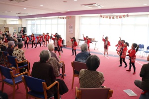 12/23、老人施設『美さと』訪問。年中年長の子ども達が元気いっぱいのお遊戯を披露してくれました。おじいちゃんおばあちゃんからたくさんの拍手を頂きました。