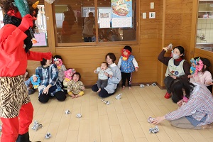 2/3、赤鬼がやってきました。ちょっと怖かったけど、みんなで豆を投げて鬼をやっつけました。